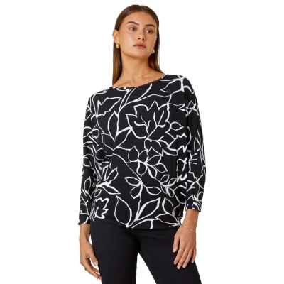 Contrast Floral Linear Print Stretch Top from Roman. Inject pretty prints into your everyday wardrobe with ease with this floral print stretch top. Cut from a comfortable stretch jersey fabric, this top features a modest round neckline and fun 3/4 length sleeves. Adorned in a bold floral, linear print this piece will elevate your everyday style. Designed to pull on, overhead this top is perfect with tailored trousers and courts for work or with leather leggings and heels for an evening with friends!