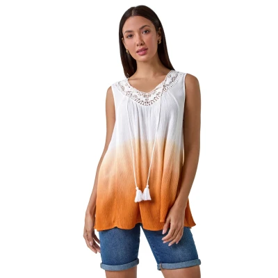 Cotton Lace Detail Ombre V-Neck Vest Top from Roman. Crafted from a cool crinkle fabric for Summer, this sleeveless swing top is perfect for the warmer weather. Designed with a feminine tie neckline which is trimmed with embroidered lace, this top has a vibrant dip dye print which is perfect for holiday season. This vest top is finished with a tassel tie detail for a fun, bohemian flair as well as a vibrant ombre design! Pair with denim shorts and sandals for the perfect beach look!