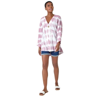 Roman Originals Cotton Tie Dye Button Detail Top for Women UK Ladies Everyday Holiday Spring Summer V Neckline Comfy Soft Evening Vacation Work Party Mauve Size 14