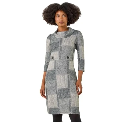 Secret SalesPatchwork Cowl Neck Button Detail Dress from Roman. This jersey stretch dress is the perfect addition to your autumn wardrobe. Featuring a cowl neck, button waist detail and an all over multicoloured stripe print, this dress is comfortable and easy to wear. Dress it up for office wear by adding tights and smart heels, or dress it down by adding boots and a oversized coatigan.