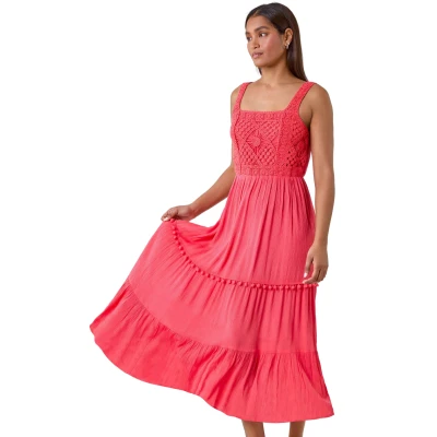 Crochet Detail Cotton Blend Maxi Dress from Roman. Look lovely in lace this Summer with our brand new strappy maxi dress! Plain in colour but not in design, this staple style has crochet overlay bodice with a flowing woven skirt. The boho tiered design adds to the elegant fit and flare shape, trimmed with pop pom bobble lace. The flattering wide straps ensure the perfect fit with a stretch shirred back for comfort whilst the square neckline provides a flattering finish. Pair this dress with a denim jacket and sandals for effortless Spring days!