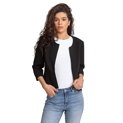 Roman Originals Cropped Bolero Jacket for Women UK Ladies Wedding Guests Shrug Jacquard Tailored Fitted Blazer Smart Work Formal Evening Short Round Collar 2 Pockets Plain Black Size 20