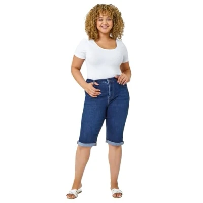 Roman Originals Denim Shorts for Women UK Ladies Knee Length Stretch Jean Cropped Jeggings Turn Up Hem Cut Off Summer High Waisted Smart Fitted Lightweight Casual Holiday Plus Indigo Size 20