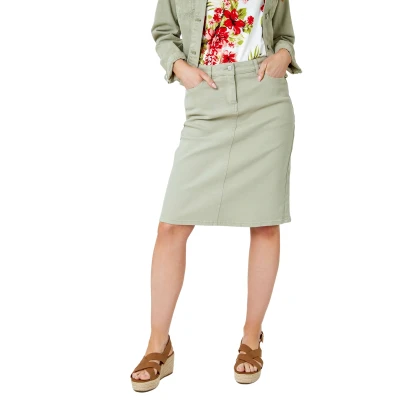 Roman Originals Denim Skirt with Pockets for Women UK Ladies Jean Skirts Cotton Stretch Mid Wash Fitted A Line Casual Smart Work Office Knee Length Flattering Slimming Sage Size 20