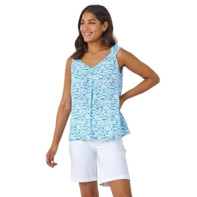 Roman Originals Ditsy Print Pleat Front Cami Top for Women UK Ladies Everyday Holiday Spring Summer V Neckline Comfy Soft Evening Vacation Work Party Blue Size 14