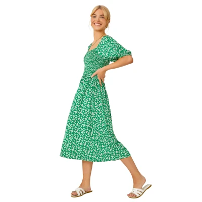 Roman Originals Dusk Fashion Women Ditsy Floral Shirred Midi Dress Ladies Spring Everyday Summer Evening Vacation Work Holiday Long Sleeve Smart Casual Green Size 12