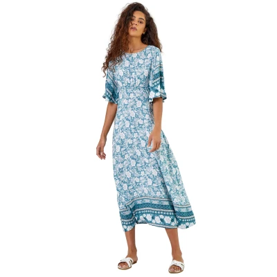 Floral Border Print Midi Dress from Roman. A new summer favourite in this floral simple but elegant dress. This number offers a round neckline with short angel sleeves with a contrast border hem. Simply add sandals and a denim jacket for a stroll in the park or a cropped jacket for a garden party.