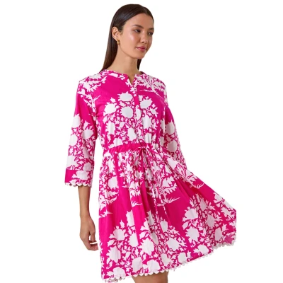 Roman Originals Floral Button Smock Dress for Women UK Ladies Everyday Holiday Spring Summer Notch Neckline Comfy Soft Evening Vacation Work Party Fuchsia Size 12