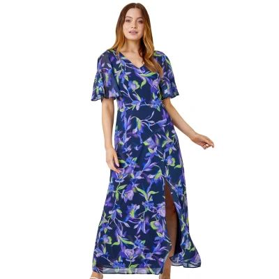Floral Print Chiffon Maxi Dress from Roman. Adorned in a striking watercolour floral print, this whimsical dress has a feminine fit and flare shape with a subtle split at the front. Topped off with short angel sleeves and a tie at the back, this v-neck dress has trendy slits on the sleeves and a bow to fasten. Cut on the bias for a comfortable stretch, this floaty full length dress is ideal for special occasions throughout Summer. Just add a fascinator and clutch bag for a day at the races or your next wedding invite.