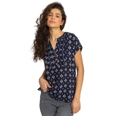 Aztec Print Button V-Neck Detail Top from Roman. Upgrade your print collection with this on-trend Aztec style print. Adorned in an all-over geo-style tile print, this notch neck number has short rolled sleeves and a half button placket to the front. Pair this wardrobe winner with your everyday jeans and sandals for a spring style then swap your jeans for shorts and sun hat to be beach-ready.