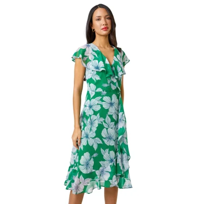 Floral Print Frill Midi Dress from Roman. This stunning linear floral print dress has us excited about the spring summer season ahead! Cut to a fit and flare shape, this style is oh so flattering! Created with a v neck wrap over style, stretchy lining, cap frill sleeves and frill detailing from the waist that falls into the hemline. Pack this gorgeous number in your holiday suitcase with your strappy sandals or heels and a fascinator for your next summer event.