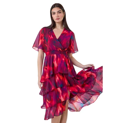 Abstract Print Chiffon Tiered Midi Dress from Roman. Discover pure elegance with this abstract print tiered midi dress from the Ariella collection. This wedding guest staple features a soft chiffon fabric with a flattering tiered silhouette and a v-neckline. Designed with a wrap front and shirred stretch waist for a fit and flare shape, this will be flattering for any formal event. The vibrant abstract print, split detail skirt, and short floaty sleeves add a touch of femininity to the finished look. Whether you're ready for a day at the races or you're Mother of the Bride, this dress is easy to pull on overhead and style with heels for timeless occasionwear.