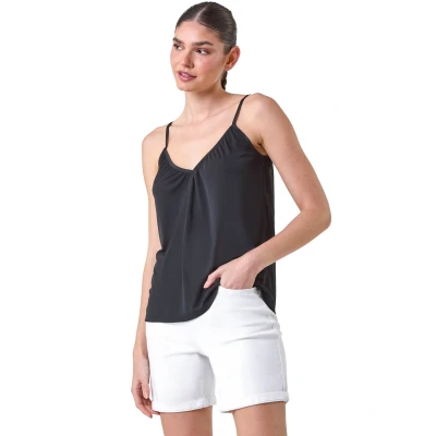 Roman Originals Gathered V Neck Stretch Vest Top for Women UK Ladies Everyday Holiday Spring Summer Neckline Comfy Soft Evening Vacation Work Party Black Size 20
