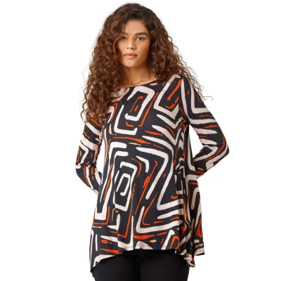 Geometric Back Detail Stretch Top from Roman. Brighten up your daytime wardrobe this Winter with this bold printed top. Cut from a stretch jersey fabric with a floaty tunic silhouette, this top features a modest round neckline and full-length sleeves. Designed to pull on overhead, this vibrant, graphic piece is sure to become a seasonal staple with its unique back bar cutout detail. Add some dark denim and boots for an Autumnal day out!