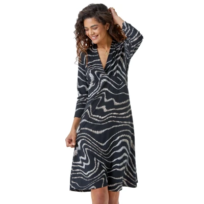 Animal Print Stretch Dress from Roman. Give your A/W wardrobe an update with this abstract animal print dress. Featuring a v-neckline this jersey stretch style has an empire line that is flattering and feminine. With 3/4 length sleeves and an at the knee hem, it gives the perfect amount of elegance. Simply pair with heeled boots and a denim jacket for an off-duty look!