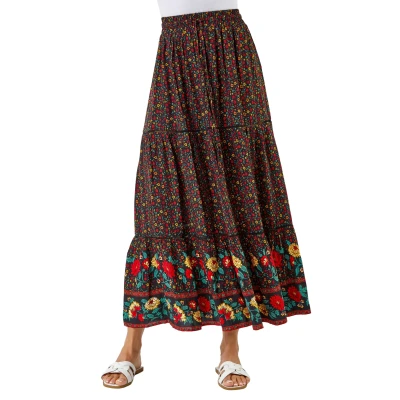 Tiered Floral Print Maxi Skirt from Roman. Crafted from the lightweight woven material, this airy boho print maxi skirt is just the thing for this summer season. A shirred elasticated waistband drifts down into a tiered flowery border print skirt and broderie trim detail to hem that's perfect for the picnic or a bar overseas. Finish this look with a plain short sleeve white T-shirt and some strappy sandals for a timeless summer look.