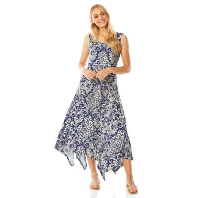 Secret SalesContrast Print Hanky Hem Midi Dress from Roman. A striking choice to see you through garden parties and holidays. This midi dress features a round neckline, a hanky hemline and combines animal and paisley print in hues of blue. Made from a lightweight stretch jersey, it is easy to slip on with your favourite pair of sandals on casual summer days.