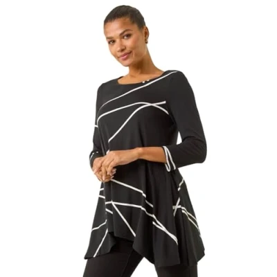 Roman Originals Hanky Hem Tunic Top for Women UK Ladies Longline Blouse Asymmetric Hemline Casual Slouch Loose 3/4 Sleeves Round Neck Relaxed Comfortable Holiday Black & White Size 18