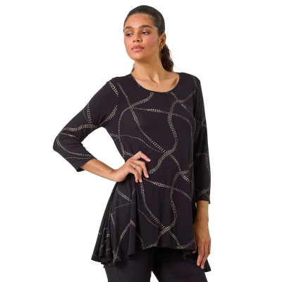 Abstract Print Hanky Hem Stretch Top from Roman. Inject some fun into your wardrobe with our abstract print hanky hem top. The flattering round neckline and trendy 3/4 length sleeves make this a standout piece. Crafted from a comfortable stretch jersey fabric, this top is adorned in a striking abstract print, perfect for the Autumn Winter season. It finishes below the hip with a stylish hanky hem detail. Style with jeggings and ankle boots for a trendy fall look.