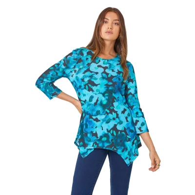 Floral Print Mesh Hanky Hem Top from Roman. Brighten up your Autumn wardrobe with this stunning printed top. Made from high-quality printed mesh fabric, this piece boasts a flattering round neckline and chic 3/4 length sleeves. The feminine floral print that adorns the top is sure to make you stand out from the crowd with its eye-catching finish. The comfortable stretch jersey underlay ensures that this top is not only stylish but also practical and easy to wear. Elevate your seasonal style by pairing it with jeans and boots for a trendy, yet effortless daytime ensemble.