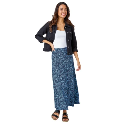 Roman Originals Jersey Skirt for Women UK Ladies Midi Maxi Floral Animal Print Autumn Winter Swing Smart Casual Work Office Cocktail Party Going Out Evening Holiday Cruise Blue & Navy Size 18
