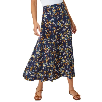 Ditsy Floral Print Elastic Waist Midi Skirt from Roman. Give a nod to the dark floral trend with this printed, jersey midi skirt. Featuring a ditsy, daisy print this skirt is cut from a stretch, jersey fabric and is designed to pull on for quick and easy dressing, with a comfortable elasticated waistband. Pair with a plain t shirt and barely there sandals for a fresh spring look!