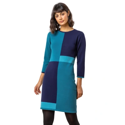 Colour Block Knitted Dress from Roman. Go for bold with your everyday style in this shift dress. Channelling the trendy colour block trend, this flattering dress features a striking print, round neck and 3/4 sleeves. Perfect for the office or an evening with your friends.