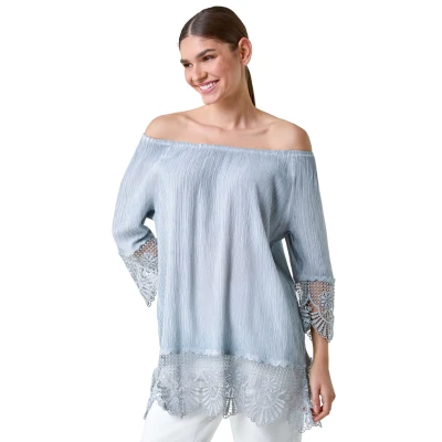 Lace Trim Textured Bardot Tunic Top from Roman. Add some versatile pieces to your Summer collection with this crinkle textured, lace trim top. Cut from a light woven fabric, this top features an elasticated, bardot neckline for a comfortable fit and 3/4 length sleeves with an intricate lace edge. This style has a flattering relaxed fit and a longline shape, trimmed with scalloped lace hem to match the sleeves. This top is perfect paired with relaxed denim and sandals for effortless Summer style!