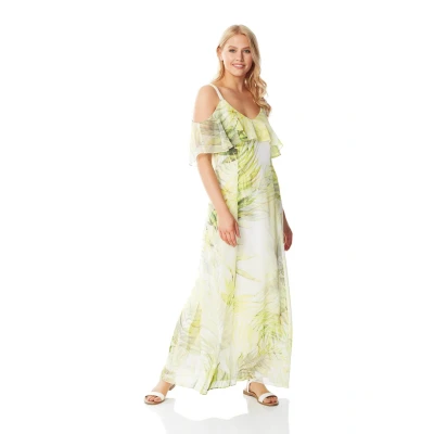 Leaf Print Cold Shoulder Maxi Dress from Roman. This floor grazing dress is made from a lightweight chiffon fabric that has an all over leaf print in hues of yellow and green. The frilled overlay and wide strap detail creates the on trend cold shoulder look. The bodice is fitted with a feminine V-neckline while the skirt is fully lined and flowy. Perfect for your next tropical get away, style yours with heeled sandals and delicate jewellery.