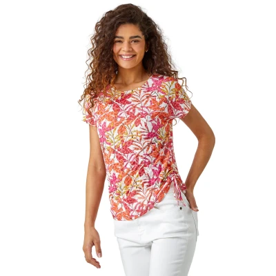 Leaf Print Side Tie Stretch Top from Roman. Add some on trend colours to your casual collection with this leaf print side tie top. Cut from a stretch jersey fabric, this piece is adorned in a colourful burnout leaf print. It features a modest round neckline and short, batwing sleeves. The bodice features two side ties complete the flattering ruching. Pair with cropped jeggings and sandals for a fuss free, on trend Summer look!
