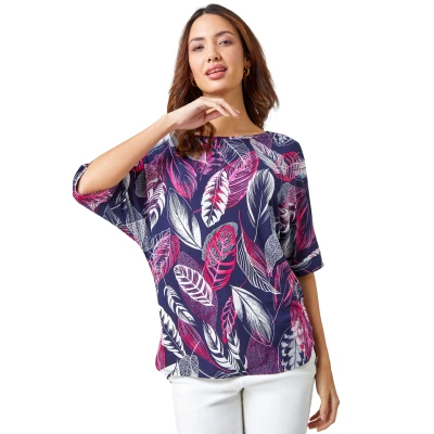 Leaf Print Textured Tunic Top from Roman. Add a statement Spring print to your seasonal wardrobe with this tropical leaf top. Cut to a relaxed tunic shape, this oversized style can be worn with ease at home or on holiday. It has a textured puff print design and comfy short sleeves as well as a curved dipped hem to flatter the figure. Complete the look with cropped stretch trousers or shorts for those Summer getaways in the Sun!