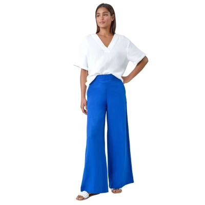 Roman Originals Linen Blend Wide Leg Trousers for Women UK Ladies Everyday Holiday Spring Summer Comfy Soft Evening Vacation Work Party Royal Blue Size 20
