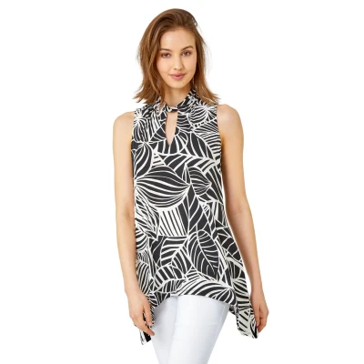 Metallic Leaf Print Stretch Top from Roman. Adorned in a linear leaf print this piece is the perfect way to add pattern into your wardrobe. Cut from a comfortable stretch jersey fabric this top features a twisted round neckline with cute keyhole cut out and is designed in a Summer-ready sleeveless style. Designed in a flattering swing shape this top has metallic accents running through it. Pair with cropped stretch trousers and sandals for simple Summer style!