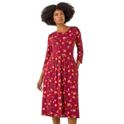 Secret SalesFloral Print Pocket Detail Midi Dress from Roman. Comfy and stylish for the new season, this floral print fit & flare midi dress is a must have.Complete with a classic round neckline, fun 3/4 length sleeves and handy side pockets, this midi dress is made from a comfortable stretch jersey fabric and cut to a loose, relaxed fit. Team with tights and boots for a chic, casual look!
