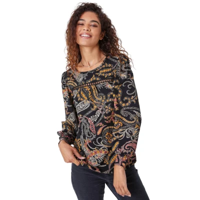 Paisley Lace Trim Top from Roman. Add some pretty paisley prints to your rotation this season with this printed, lace trim top. Cut from a stretch jersey fabric, this piece features a modest round neckline and full length sleeves with thick elasticated cuffs. It features a ladder lace detail across the front of the chest for a delicate finishing touch. Add mom jeans and either boots or heels dependant on occasion for an on trend look!