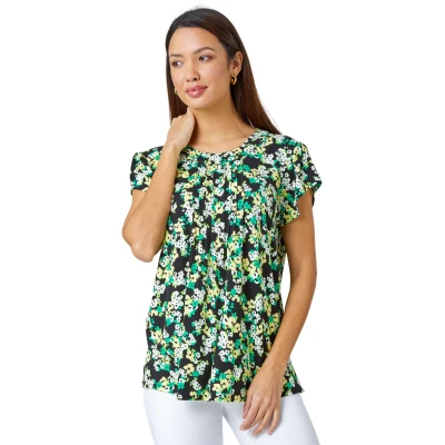 Floral Print Pleat Detail Blouse from Roman. Tailor your look to any occasion with the help of this ditsy floral beauty! This stretch jersey top is an easy everyday style for any occasion. Topped off with short sleeves and a round neckline, this t-shirt has flattering pleat detail at the front. Fastened with a roulou loop and button at the back, this smart blouse will look great paired with trousers for work or jeans on the weekend.