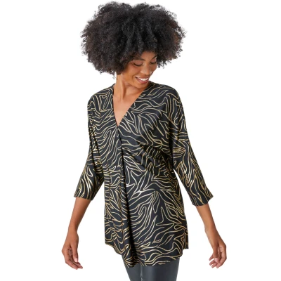 Metallic Print Tunic Top from Roman. Get party ready with this metallic print tunic top. Cut from a stretch jersey fabric, this piece is designed in an oversized, tunic style for extra coverage and comfort. It features a feminine v neckline and fun 3/4 length sleeves. It’s adorned in a striking metallic print that catches the light beautifully. Pair with leather look leggings and heels and you’re good to go!