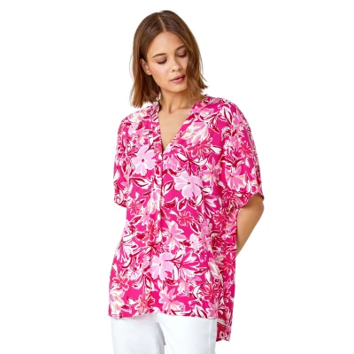 Floral Print Pleat Front Overshirt from Roman. This relaxed fit overshirt is the perfect everyday piece for the Spring and Summer season. It features short sleeves, a flattering pleat front and a curved hem for a complimentary fit. Adorned in a feminine floral print, this notch neck blouse can be easily dressed up or down to suit any occasion. Style with cropped stretch trousers and sandals for effortless Summer style!