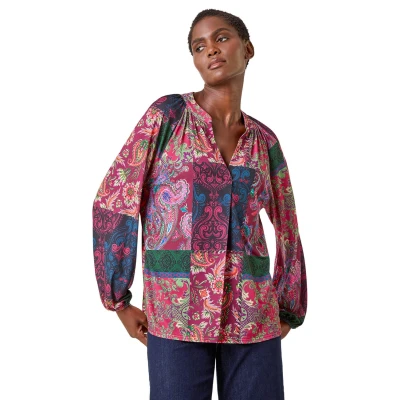 Patchwork Print Stretch Jersey Shirt from Roman. Introduce on-trend prints to your new season collection with this patchwork, paisley print shirt. Cut from a comfortable stretch jersey fabric this shirt features a flattering notch neckline and sophisticated full-length sleeves finished with elasticated cuffs. A pleat front detail creates a flattering fit throughout while the patchwork print adds interest. Pair with tailored trousers for work or add leather trousers and heels for an evening with friends!
