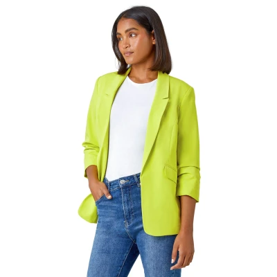 Roman Originals Ruched Sleeve Stretch Blazer for Women UK Ladies Everyday Holiday Spring Summer Edge to Opening Comfy Soft Evening Vacation Work Party Lime Size 14