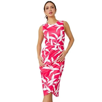 Secret SalesLeaf Print Ruched Shift Dress from Roman. A timeless silhouette that wins a spot in our wardrobe! With a bold all-over leaf print that will turn heads at your next Summer event, this round neck design is cut from a super soft scuba stretch fabric and is fully lined giving you comfort when you need it most. Finished with a pleat detail to the side of the waist, this figure skimming dress just needs heels for your next special occasion!