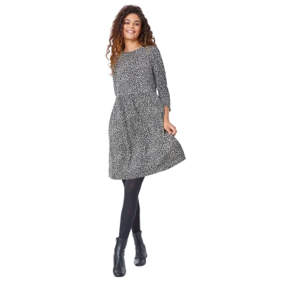 Secret SalesAnimal Print Stretch Dress from Roman. Be cosy and casual with this animal print, woolly touch dress. Cut from a stretch jersey fabric this piece is both comfortable and stylish, with its chic animal print. It features a modest round neckline, fun 3/4 length sleeves and a relaxed waist line. Its cut in a fit and flare style and finishes at the knee. Pair with tights and boots for an on trend, off duty look!