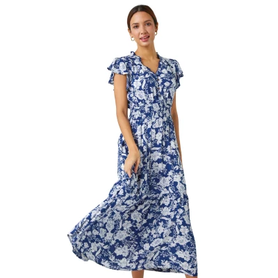 Secret SalesFloral Print Frill Detail Midi Dress from Roman. Feminine florals combine with delicate frills to create this pretty, midi dress. Cut from a cool, woven fabric this piece features a v neckline trimmed with pretty frill detail. Short frill sleeves, a shirred waist and a tiered hem add extra striking detail. A partial open front is finished with simple button detail. The skirt falls in a flattering fit and flare style to its midi length hem line. Add heeled wedges for a smart, casual Summer look!