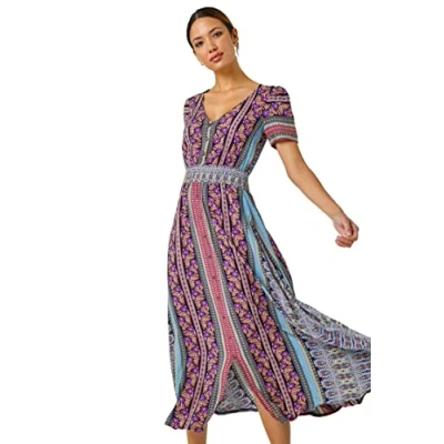 Our newest daywear v-neck maxi dress. Made with short sleeves, a frilled hemline, this dress has a beautiful shirring effect to the waist with an added tassel tie detail. Giving us Boho-chic all season long With a button down front, this is the best dress for living out the sunnier seasons this year. Pair with your everyday flats and a cardi for a daytime outfit or dress it up with statement jewellery and sandals for a bohemian dream. This dress is available in animal print, floral print, ditsy floral print, paisley print, boho print, palm print, abstract print, polka dot print, aztec print, spot print, leopard print, lace, textured print, border print, abstract zig zag print, tropical palm print. Available in Midi, Maxi, long and full lengths in Standard, Petite, Curve and Plus sizes. Please click our store link to visit our Roman shop and see our entire range. The length of this dress is approx 142cm.