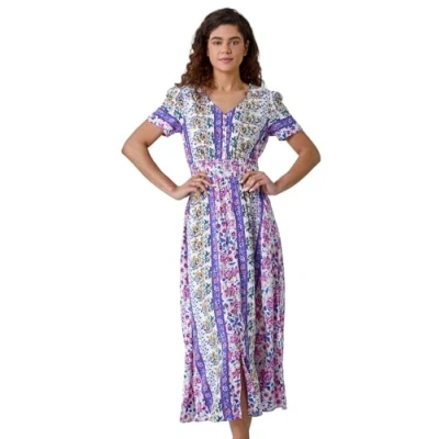 Roman Originals Shirred Waist Dress for Women UK Ladies Midi Maxi Summer Spring Tiered Frill Hem Short Sleeve V Neck Button Through Boho Bohemian Gypsy Holiday Purple & White Size 16