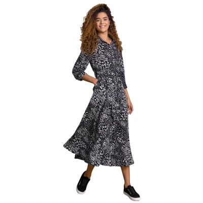 Animal Print Belted Shirt Dress from Roman. Keep it simple with this smart button through shirt dress. Finished with a shirt collar and button-down fastening, this mixed animal print day dress is effortlessly stylish for everyday wear. A fabric tie belt cinches in the waist and creates a flattering fit with this demure midi length and a-line silhouette. Style this wild print with pumps and a leather jacket for fashion forward daywear or dress it up with heels for dinner.
