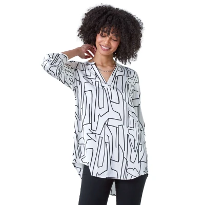 Abstract Print Longline Top from Roman. Add elegance to your everyday style with this longline woven top. Cut from a lightweight fabric, this blouse features a feminine v-neckline, finished with a striking linear print and 3/4 length tab sleeves. Designed in a longline length, this piece is perfect paired with tailored trousers for work or cropped trousers and sandals for breezy Summer days!
