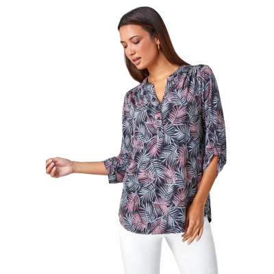 Leaf Print V-Neck Stretch Jersey Blouse from Roman. This leaf print jersey top is sure to take your Autumn casualwear to the next level. Cut from a comfortable stretch jersey fabric, this blouse features 3/4 length sleeves with adjustable button tabs and a playful pleat detail at the shoulder. Adorned in a bold leaf design, this comfy casual piece is sure to bring some life into the colder months. Pair with jeans for a sophisticated daytime style.