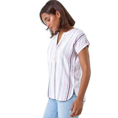 Stripe Print Button Detail V-Neck Top from Roman. Warm weather calls for flattering shapes and soft prints and this top has both! Cut from a smooth woven fabric, this piece features a flattering notch neckline, finished with flattering pleats and cute button detail. Short sleeves feature stylish turn up cuffs and tab button detail at the shoulders. Adorned in an timeless stripe print, this blouse will earn you some serious style points. Simply pair with shorts and sandals for a Summer ready look!
