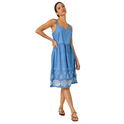 Sleeveless Cotton Embroidered Midi Dress from Roman. Feminine and fun for the new season, this pretty fit and flare dress is just what your wardrobe needs! Decorated with embroidery at the hem, this gathered skater style finishes just below the knee for a flattering fit. The 100% cotton material makes this denim look dress so light and breathable for the Summer. It has a sleeveless shape, wide straps and a sweetheart neck with stretchy shirring at the back to easily pull on and go. Style with a denim jacket and pumps for casual Spring outfits!